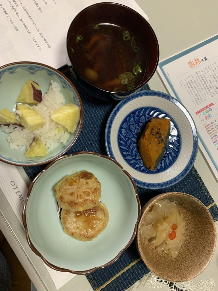薬膳教室で旬の野菜たちのランチ、かぼちゃにレンコンやさつまいもご飯に白くらげのデザート 美味しかった🎶