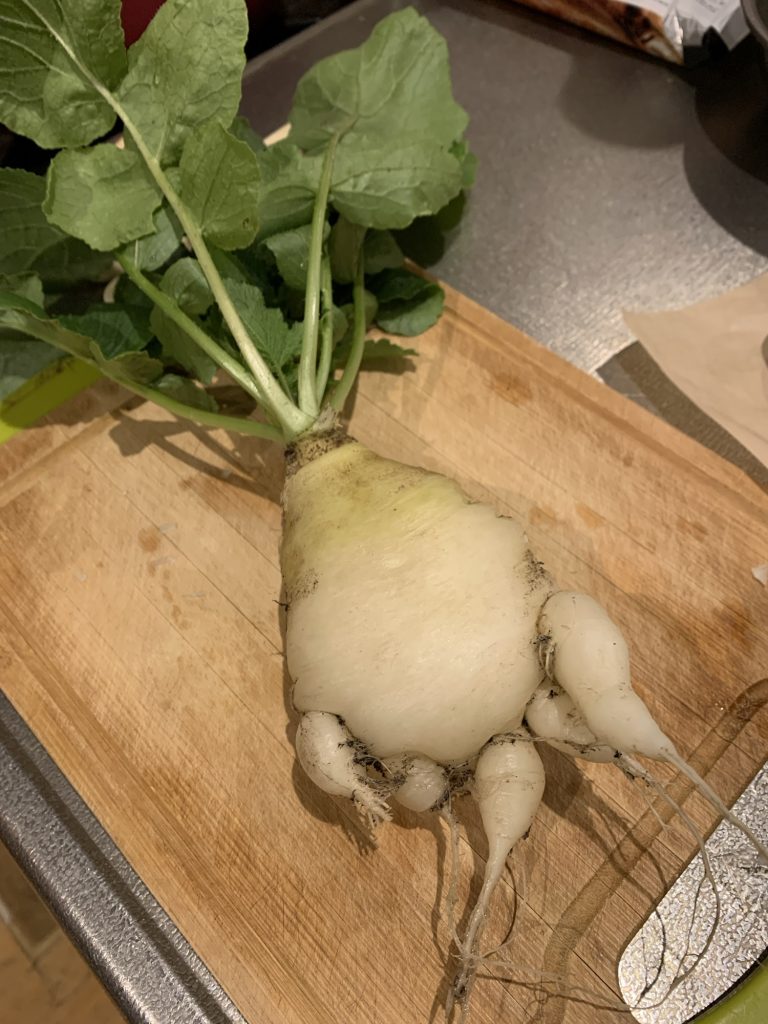 テラスのベジトラに植えっぱなしだったカブを使って七草粥もどき😆
