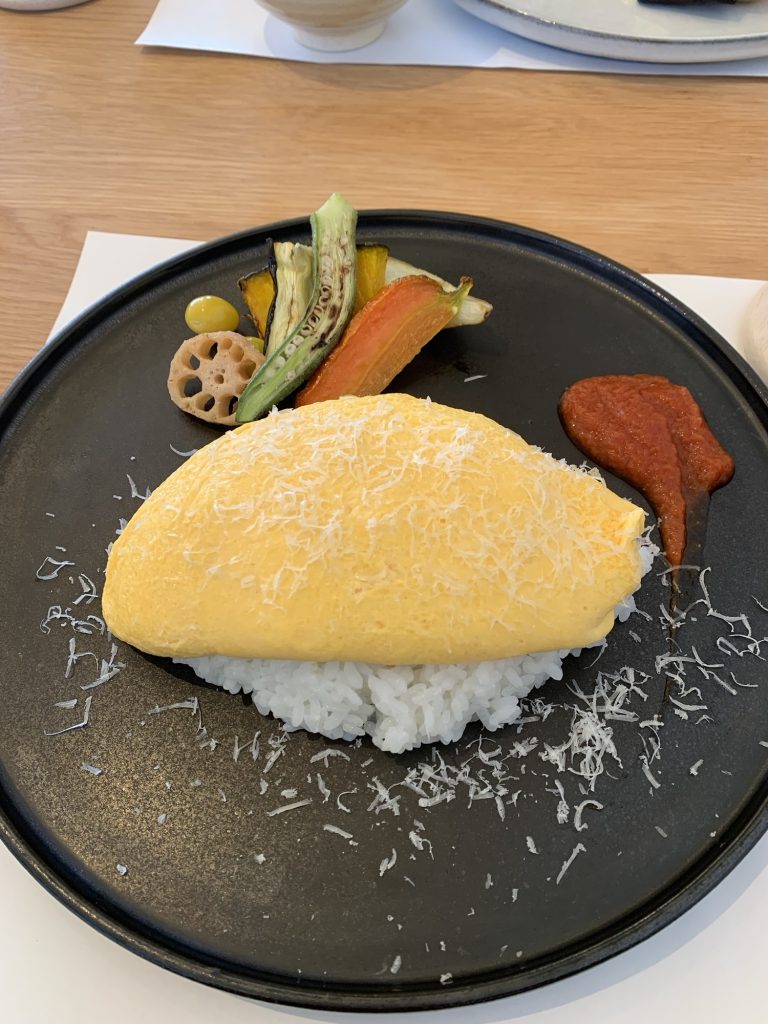 平飼い卵を使ったオムライスは白いご飯にのってて、卵の下に温泉卵も潜んでた😱贅沢すぎる〜💦