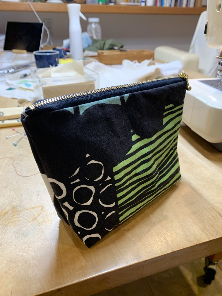マリメッコのエコバッグの持ち手が擦れてきたから何かにリメイクしてって友達に渡されたので、YouTubeを見ながらポーチ作ってみる、ファスナー苦手だったけどなんとかできたわ😆